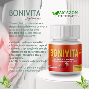 O Bonivita é um suplemento completo, desenvolvido para promover saúde, vitalidade e bem-estar de forma natural e eficaz. Sua fórmula combina vitaminas, minerais e colágeno tipo II, oferecendo suporte para o fortalecimento muscular, ósseo e das articulações, além de contribuir para o aumento da imunidade, energia e disposição ao longo do dia.